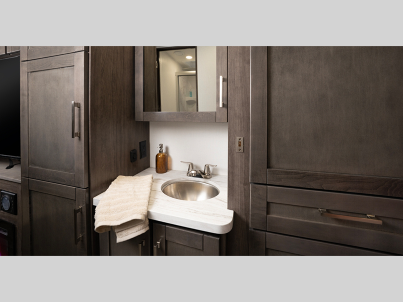 Each is equipped with E-Z Drive which is a computer-balanced driveshaft, with standard front and rear stabilizer bars, Hellwig helper springs, and rubber isolation body mounts. Some construction features include a one-piece, seamless fiberglass front cap with an automotive-bonded panoramic window and power shade, TuffShell vacuum-bond laminated sidewalls and floor, plus bead-foam insulation. The interior offers a custom-molded ABS surround in the cab-over area with overhead bunk for extra sleeping space, an 84-inch ceiling height for spacious living, LED-lit kitchen countertops, and the Entegra-exclusive easy-operation legless dinette table for more leg room.