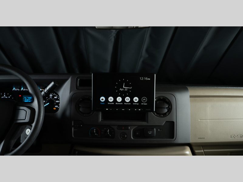 - E-Z Drive™; Automotive-bonded panoramic window in front cap with power shade; Frameless windows; Heated holding tanks (12V pads); Electric patio awning with LED lights; Black tank flush; Sony® infotainment center with Apple CarPlay® and Android Auto™; Backup and side-view cameras; LED HD Smart TV in living area