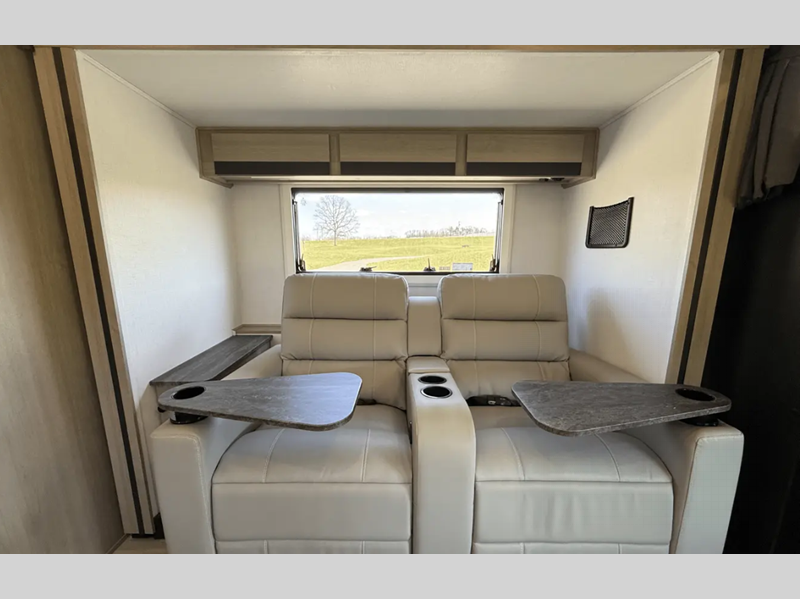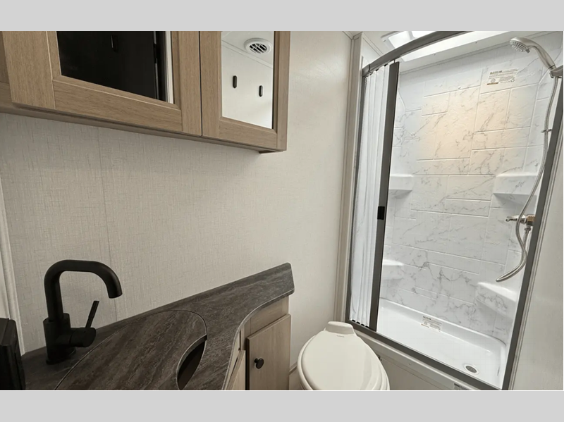 Some of the top features include a fiberglass laminated roof, a Winegard Air 360+ digital antenna to stay connected as you camp, plus a 10.7 cu. ft. 12V refrigerator for plenty of food storage. There is also an outside shower, a power awning with LED lights, and an optional 12V solar charging system for off-grid capabilities! Interior comforts include black out roller shades, an oxygen-infused shower head, soft touch self-closing drawer guides, and so much more!