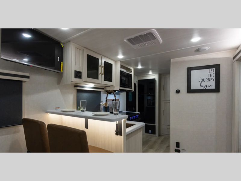 Sleeps 5 Slides 1 Length 30 ft 9 in Ext Width 8 ft Ext Height 11 ft 3 in Hitch Weight 715 lbs GVWR 7715 lbs Dry Weight 6158 lbs Cargo Capacity 1557 lbs Fresh Water Capacity 40 gals Grey Water Capacity 60 gals Black Water Capacity 30 gals Available Beds Queen Refrigerator Type 12V Black Glass Refrigerator Size 10 cu ft Cooktop Burners 3 Number of Awnings 1 Water Heater Type Tankless AC BTU 15000 btu TV Info LR HD TV Awning Info 21' Electric w/LED Light Strip Axle Count 2 Shower Type Standard Electrical Service 30 amp Solar Wattage 200 watts Similar Floorplans