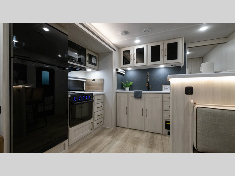 Sleeps 4 Slides 1 Length 24 ft 4 in Ext Width 7 ft 4 in Ext Height 10 ft 9 in Hitch Weight 425 lbs GVWR 5625 lbs Dry Weight 4128 lbs Cargo Capacity 1497 lbs Fresh Water Capacity 30 gals Grey Water Capacity 30 gals Black Water Capacity 30 gals Available Beds Queen Refrigerator Type 12V Black Glass Refrigerator Size 10 cu ft Convection Cooking Yes Cooktop Burners 2 Number of Awnings 1 Water Heater Type Tankless AC BTU 15000 btu TV Info LR HD TV Awning Info 16' Electric w/LED Light Strip Axle Count 1 Shower Type Standard Electrical Service 30 amp Solar Wattage 200 watts Similar Floorplans