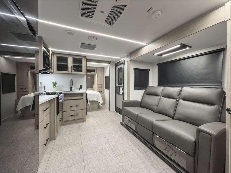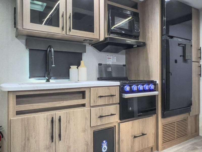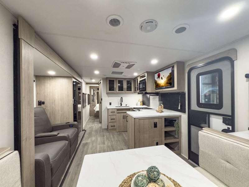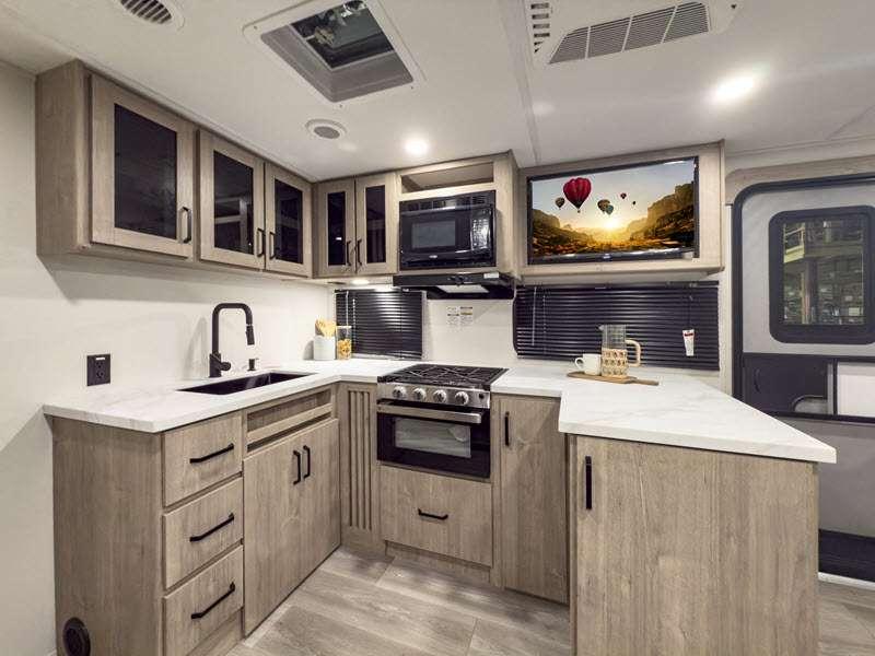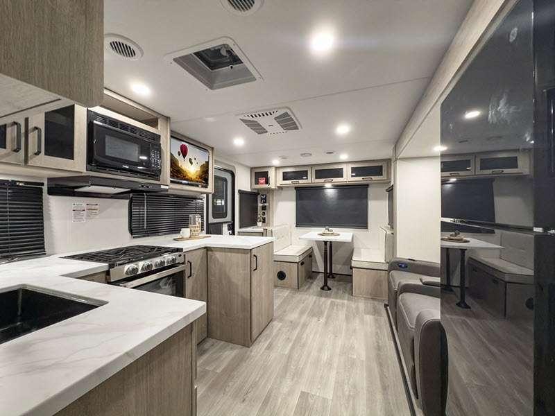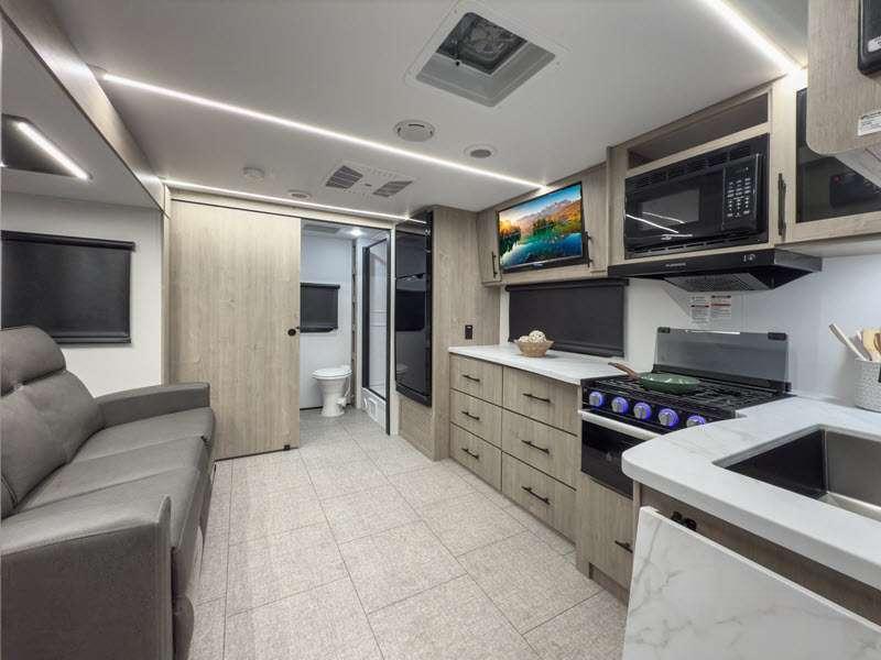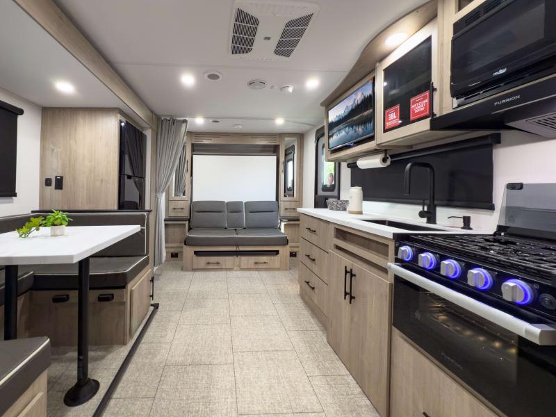The gel-coated fiberglass exterior and one-piece roof membrane form the base that holds all of the many features, like the three-burner range with an oven, residential walk-in shower, high capacity furnace, and LED HDTV. The friction-hinge entry door won't fly away when you open it, and the residential countertops will let you set down dinner plates. There is a large panoramic window and LED lighting to keep your trailer feeling open, and the four packages included will provide even more features you won't want to camp without. Some of these features include a 200W solar panel, an accessory hitch, and a full width pass-thru storage!