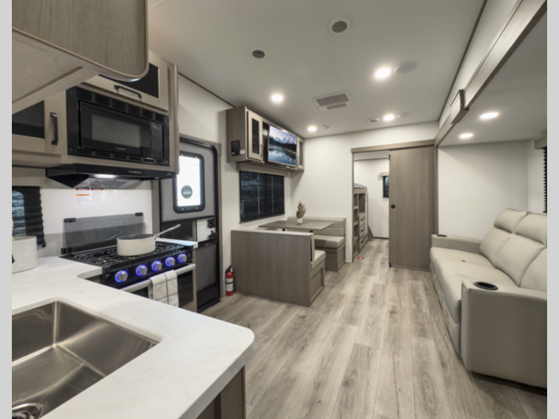 Sleeps 3 Slides 1 Length 30 ft Ext Width 8 ft Ext Height 12 ft Hitch Weight 950 lbs GVWR 9995 lbs Dry Weight 7664 lbs Fresh Water Capacity 55 gals Grey Water Capacity 78 gals Black Water Capacity 39 gals Tire Size ST225/75R15 LRE Furnace BTU 30000 btu Available Beds Queen Refrigerator Type 12V Refrigerator Size 10 cu ft Cooktop Burners 3 Shower Size 30" x 36" Number of Awnings 1 LP Tank Capacity 30 lbs Water Heater Type On Demand Tankless TV Info LR 40" High-Definition LED TV Awning Info 19' One Touch Electric LED Axle Count 2 Number of LP Tanks 2 Shower Type Walk-In Shower Electrical Service 50 amp Similar Floorplans
