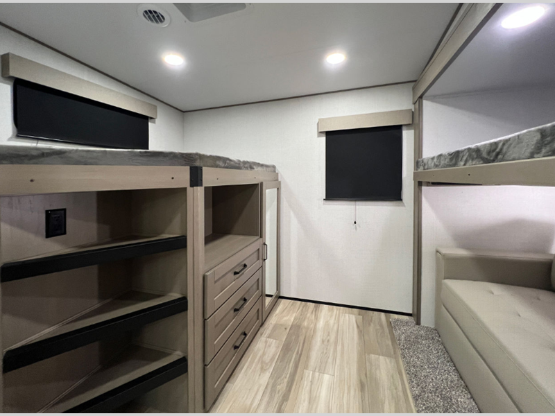 Sleeps 7 Slides 4 Length 36 ft 11 in Ext Width 8 ft Ext Height 12 ft 3 in Hitch Weight 2450 lbs GVWR 13995 lbs Dry Weight 11700 lbs Fresh Water Capacity 74 gals Grey Water Capacity 87 gals Black Water Capacity 87 gals Tire Size ST235/80R16RLE Furnace BTU 35000 btu Number Of Bunks 2 Available Beds Queen Refrigerator Type 12V Refrigerator Size 16 cu ft Cooktop Burners 3 Number of Awnings 2 LP Tank Capacity 30 lbs Water Heater Type On Demand AC BTU 15000 btu TV Info LR 40" TV Awning Info 13' & 10'6" One-Touch Electric LED Axle Count 2 Number of LP Tanks 2 Shower Type Radius Electrical Service 50 amp Similar Floorplans