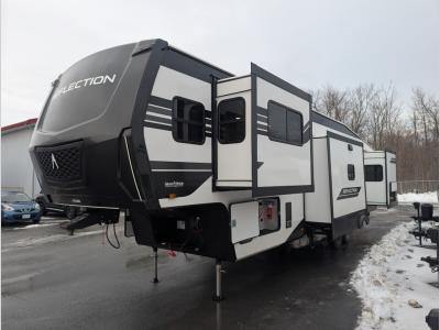 Reflection is built with the Arctic 4-Season Protection package which provides a 35K BTU high-capacity furnace, double insulated roof and front cap, a heated and underbelly with circulating heat, and 12V heat pads on the holding tanks to mention a few features that allow you to travel during any climate. The interior offers residential cabinetry, a deep-seated stainless-steel kitchen sink in the gourmet kitchen, a spacious shower with a glass door, and ductless flooring in the living area to name a few comforts.