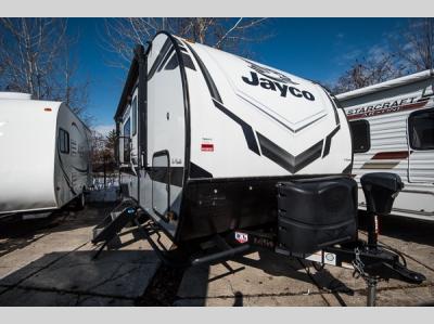 This versatile travel trailer is the perfect couple's trailer with space for an overnight guest on the booth dinette. The front sofa will provide space to relax during the day, and you can fold down the Murphy bed when you're ready to sleep. Whip up some eggs on the three burner cooktop, or use the microwave oven for instant oatmeal, plus there is an outside griddle for the JayPort system so you can make breakfast outside. This model also includes a spacious full rear bath with a shower, medicine cabinet, plus a large linen closet for clean towels.