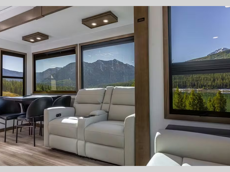 Sleeps 6 Slides 5 Length 42 ft 7 in Ext Width 0 ft Ext Height 13 ft 4 in Interior Color Oakmont Exterior Color Volcano, Cobalt, Sterling, Glacier Full-Body Paint Choices Hitch Weight 2810 lbs Dry Weight 15644 lbs Cargo Capacity 2356 lbs Fresh Water Capacity 70 gals Grey Water Capacity 78 gals Black Water Capacity 39 gals Tire Size 215/75R17.5H Furnace BTU 35000 btu Available Beds King Refrigerator Type Residential w/ Ice maker Refrigerator Size 18 cu ft Convection Cooking Yes Cooktop Burners 3 Shower Size 48" x 30" Number of Awnings 2 LP Tank Capacity 30 lbs Water Heater Type On Demand AC BTU 45000 btu TV Info Smart HDTV; LR, BR Awning Info 13' & 16' Electric with LED Lights Axle Count 2 Washer/Dryer Available Yes Number of LP Tanks 2 Shower Type Shower w/Seat Electrical Service 50 amp Similar Floorplans