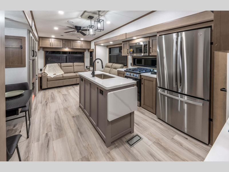 Sleeps 4 Slides 3 Length 37 ft 10 in Ext Width 8 ft Ext Height 12 ft 8 in Interior Color Mink, Pebble Hitch Weight 2260 lbs GVWR 13700 lbs Dry Weight 11600 lbs Cargo Capacity 2100 lbs Fresh Water Capacity 76 gals Grey Water Capacity 50 gals Black Water Capacity 50 gals Tire Size 16" Furnace BTU 35000 btu Available Beds King Refrigerator Type Residential Refrigerator Size 18 cu ft Convection Cooking Yes Cooktop Burners 4 Shower Size 48" x 30" Number of Awnings 1 Axle Weight 9340 lbs LP Tank Capacity 30 lbs Water Heater Type On Demand Tankless AC BTU 15000 btu TV Info LR 43" Smart LED TV Awning Info 18' Power w/LED Light Strip Axle Count 2 Washer/Dryer Available Yes Number of LP Tanks 2 Shower Type Shower w/Seat Electrical Service 50 amp Similar Floorplans