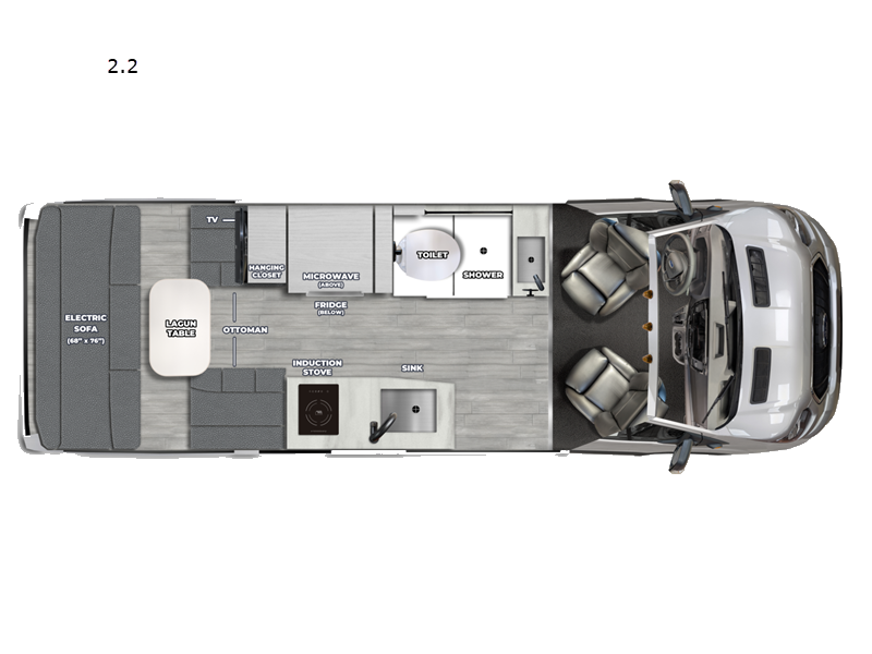 This 2.2 Ontour model is similar to model 2.0, but with a larger refrigerator, and more storage space in the bath. The rear power sofa converts to a 68" x 76" queen-sized bed with memory foam cushions for all-around comfort and the wet bath allows you to clean up each day. There is also a vanity with storage, a sink, and a Corian countertop in the bath for added convenience. Prepare meals either on the one burner induction stove top or in the microwave oven and clean-up will be a breeze with a stainless-steel sink that includes a high-arc faucet.