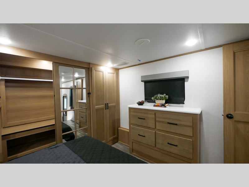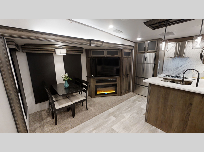 Each luxurious model features real wood cabinet doors, heat rated solid surface countertops throughout, blackout roller shades, and a king-size bed to provide the highest level of owner satisfaction. These fifth wheels also include an electric awning with LED lights outside, as well one-touch auto leveling, doggy d-ring, and a labeled universal docking center to have you set up to camp in no-time!