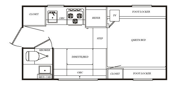 Rear Corner Bath w/Shower, Toilet, Sink, Medicine Cabinet, Booth Dinette, Refrigerator, 3 Burner Range, Kitchen Sink, Closet, Queen Bed Over Cab Area w/Foot Lockers Both Ends & Closet, Swivel TV & More. Also, 20 Gallon Grey Water Tank on Short-Bed Model.