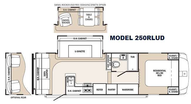 Add optional lounge chairs in the rear to replace the sofa if you like. Or, you could choose a free standing dinette with four chairs and a swivel rocker in place of the large u-shaped dinette to be in the slide out.