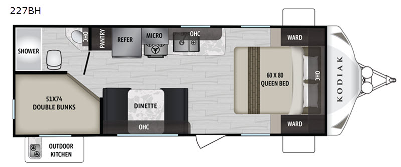 With any Dutchmen Kodiak Ultra-Lite travel trailer you can enjoy four seasons of camping thanks to the heated and enclosed underbelly and the easy-to-tow bear cage aluminum frame construction. Three more exterior features that you will certainly appreciate are the bear cave pass-through storage bay, the aluminum entry steps, and the electric adjustable awning with LED lighting that offers more living space outdoors. Adventure awaits, and inside comfort is available in any model you choose!